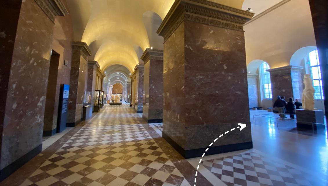 ⬆️ Folgen Sie der Richtung der Tour und gehen Sie nach rechts, bis Sie die Halle erreichen, in der Sie die beeindruckende Venus von Milo finden.
